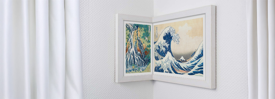 Een hoeklijst bestaat steeds uit twee delen. Deze delen zien eruit als twee afzonderlijke lijsten, met het verschil dat ze aan de middelste rand doorlopend zijn. De twee glazen liggen frameloos tegen elkaar aan de binnenrand. Om een foto in te voegen, moet deze in twee delen worden verdeeld, zodat beide zijden van het hoekkader kunnen worden geladen. Het motief is vrij te kiezen. U kunt een panoramisch landschap of gewoon een foto of beeld in tweeën delen en het beste tot zijn recht laten komen. Maar ook twee afzonderlijke foto's kunnen in zo'n kader uitstekend worden gepresenteerd.