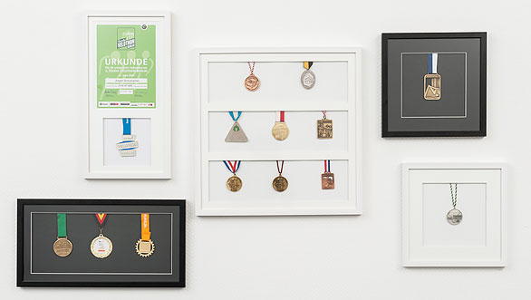 De lijsten voor het opbergen van medailles hebben dus een zogenaamde afstandsstrook die, zoals de naam al doet vermoeden, de gewenste afstand tussen de achterwand en de glasplaat creëert. Elk frame heeft ook een stabiele passe-partout, die afhankelijk van het aantal en de opstelling van de medailles optimaal wordt uitgesneden. Het ondersteunt een eenvoudige en praktische presentatie van de medailles en draagt bij aan een beter diepte-effect. De linten zijn kunstmatig achter het karton opgeborgen en de medaille krijgt een prominente plaats. Ook de grootte van de medaille levert geen problemen op. De sport waarin de medaille werd gewonnen, speelt dus geen beslissende rol of de trofee wel in het frame passt of niet.